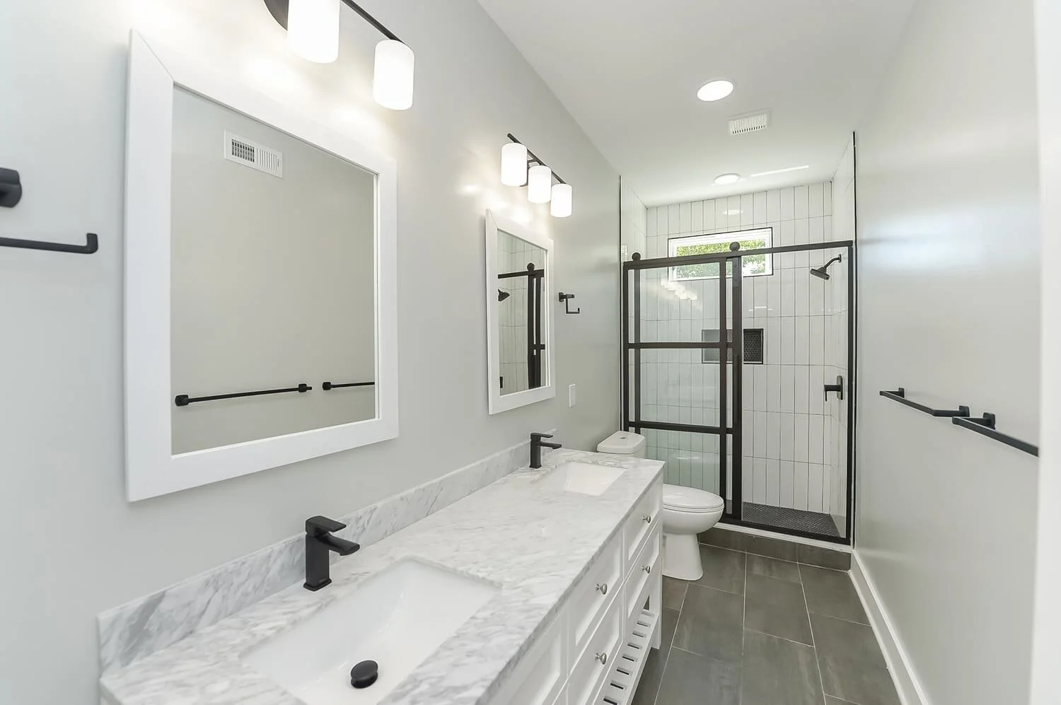 Bathrooms are equipped with sliding shower doors, electric lighted LED mirrors, gorgeous vanity/cabinetry sets, European wall and floor tile, recessed lights, and chic black matte accessories, – all procured and delivered directly to the job site by Mega Supply Pro.