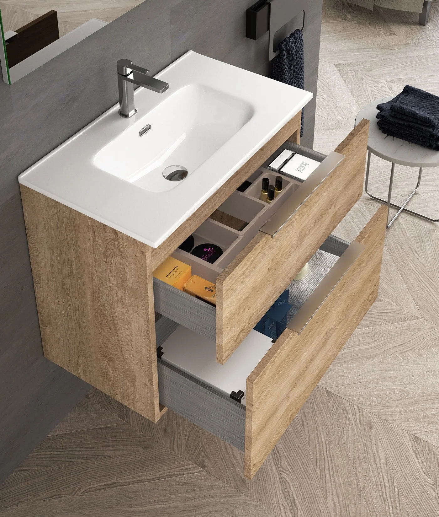 Wood-look and wood-faced vanities are trending, but in apartments you want finishes that resist swelling, chipping, and constant cleaning chemicals.