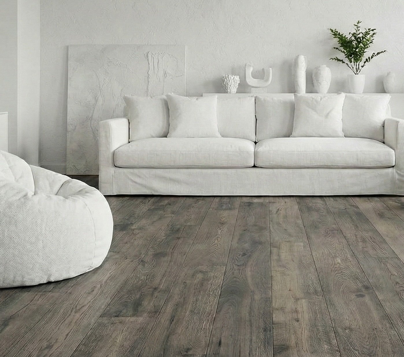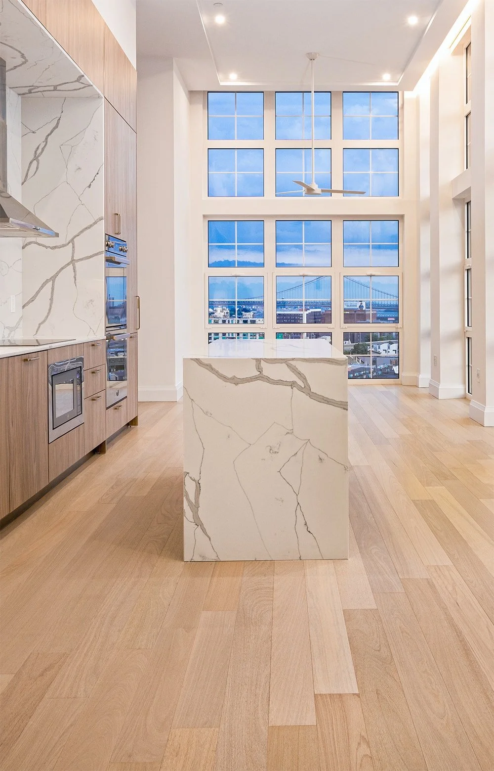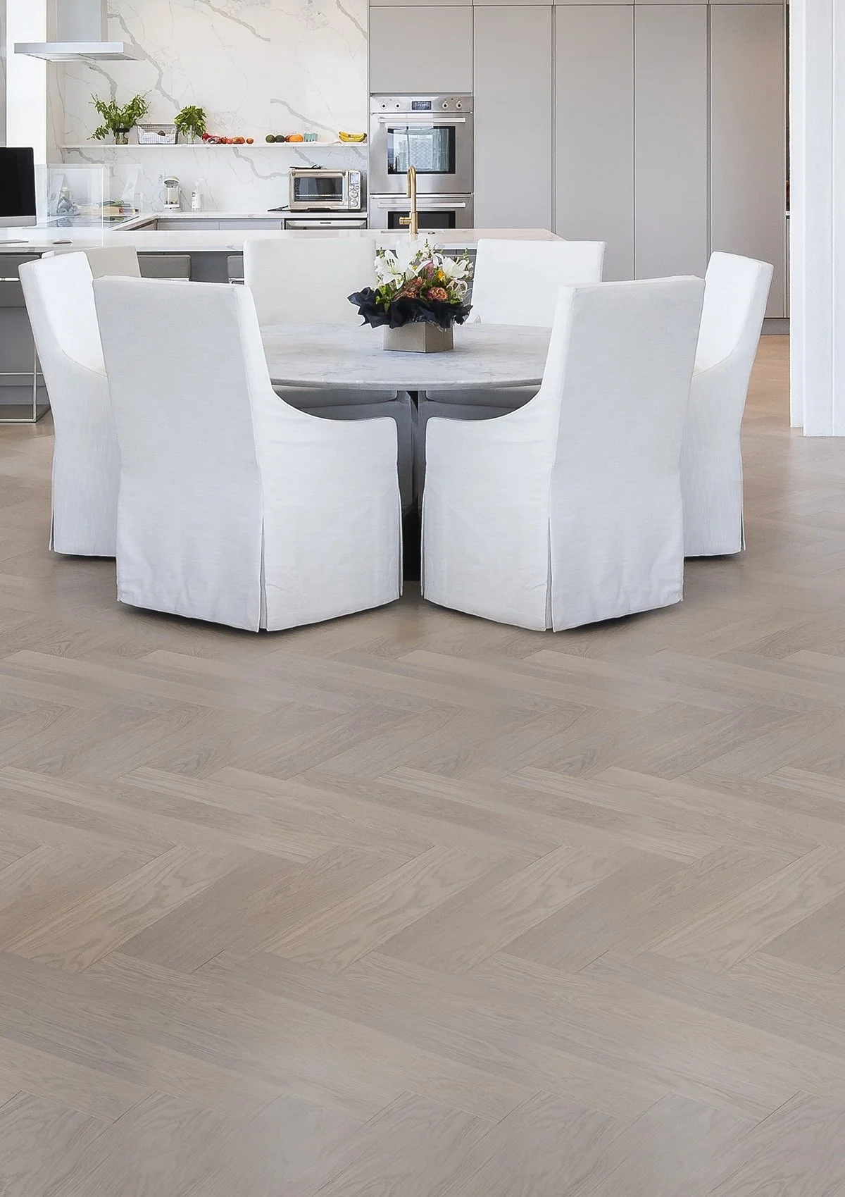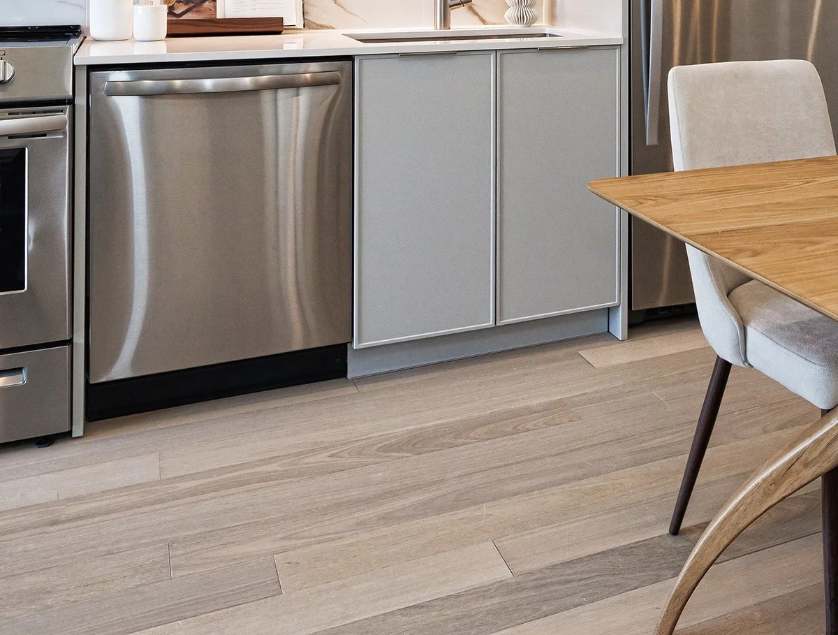 BruBox features clean, modern hardwood flooring, procured and delivered by Mega. Its light, natural tone enhances the airy, open feel of the units. The wide planks highlight subtle wood grain and soft variation, creating a warm foundation that complements the minimalist kitchen and bright white finishes. Designed for everyday durability and long-term performance, this hardwood flooring delivers a refined look while standing up to active living.