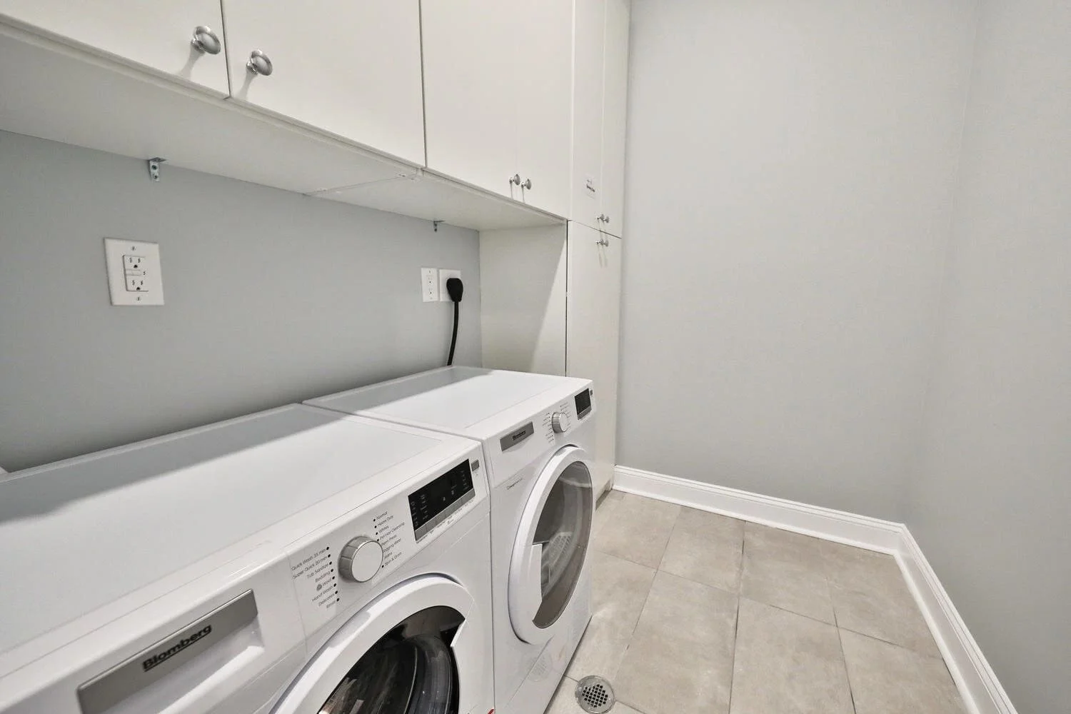 Up the floating stairs the second floor presents two large bedrooms, hallway bathroom with tile floors, floating single vanity, a lighted LED Mirror, and a stylish shower tub wrapped in subway tile, also procured by Mega Supply Pro specialists. We’ve also sourced the perfect washer and dryer for the laundry room, as well as custom cabinetry for the huge walk-in closet.