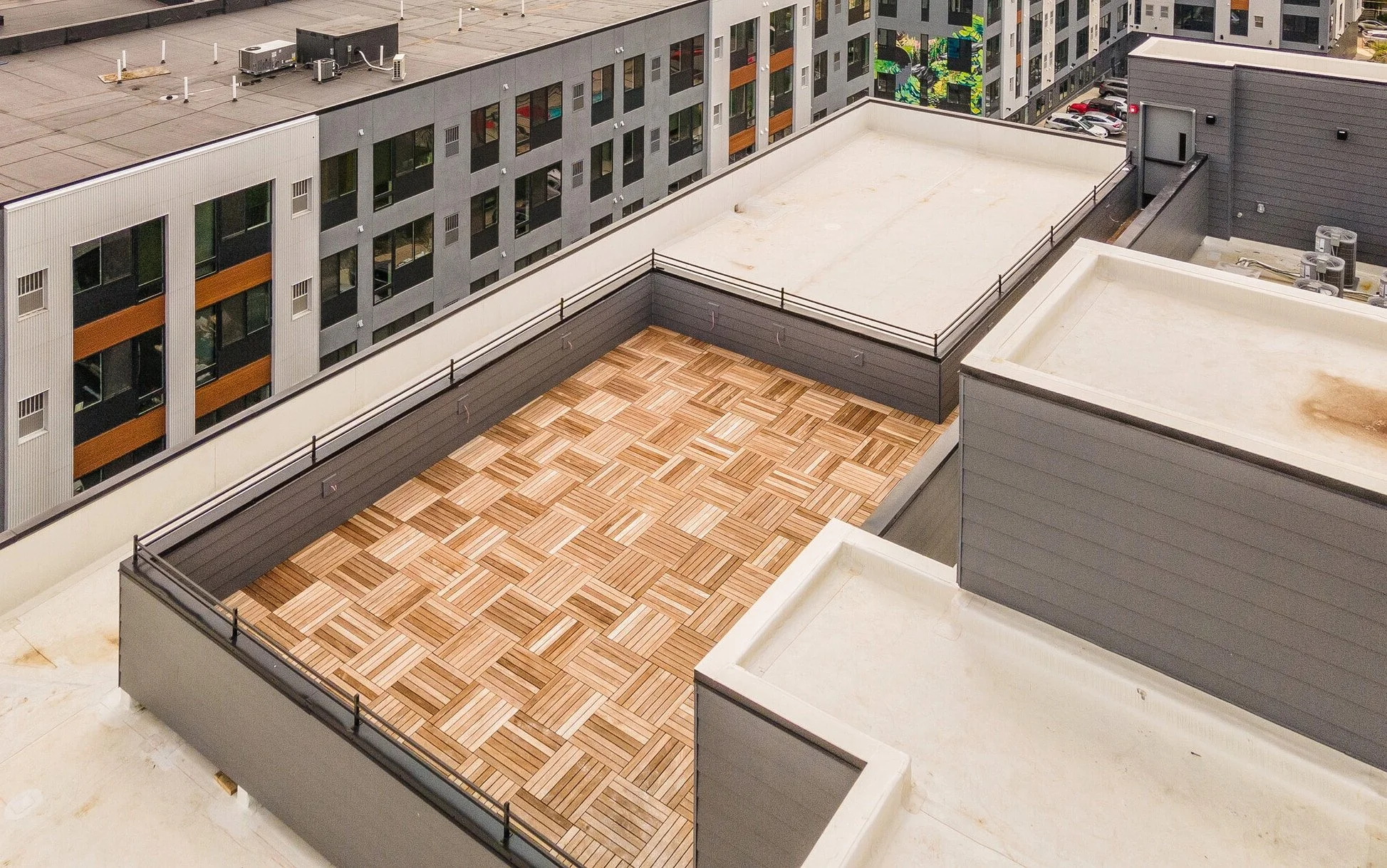The building features a 6-stop elevator, fully furnished rooftop deck, onsite parking, fitness center, trash-chute per floor, and mail/package room. The units are outfitted with class-A finishes, such as Samsung stainless steel appliances, modern European style cabinetry, waterfall quartz countertops and backsplashes, latch smart access, smart thermostats, custom organized closet systems, and private balconies.